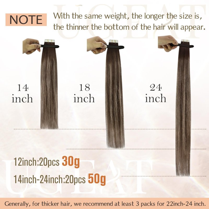 - 【Specifications】Each package of Ugeat Tape in Hair Extensions contains 20 pieces, with each piece weighing between 1.5-2.5g. The length of the extensions ranges from 14-24 inches, allowing you to choose the perfect length for your desired hairstyle.
