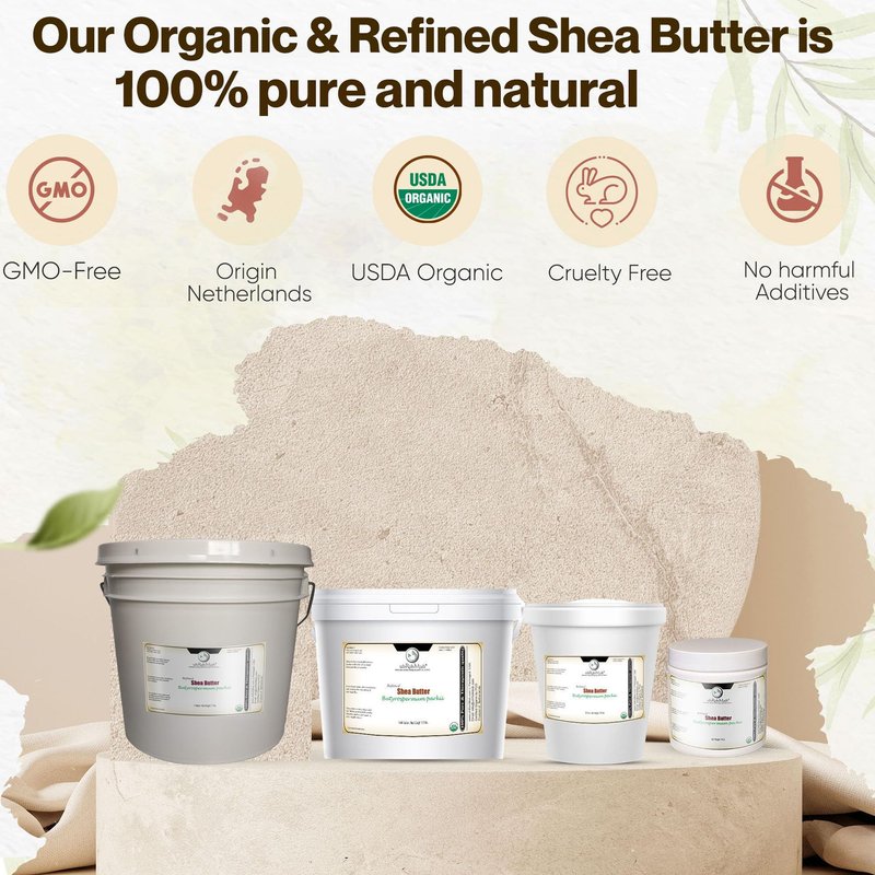 - Pure and Organic: Our USDA-certified pure shea butter is sourced from the Netherlands and contains no synthetic additives or preservatives. Refining is done using diatomaceous clay and is approved by organic bodies worldwide. It is the perfect natural solution for those looking to nourish and protect their skin.