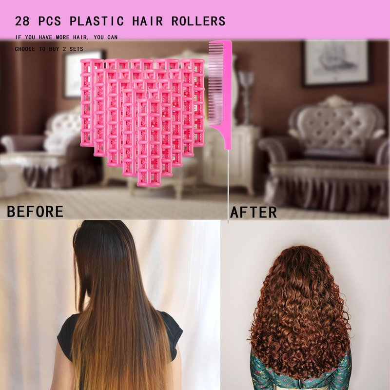 SPECIFICATIONItem:28PCS Plastic Hair Rollers SetMaterial: PlasticColor: pinkProduct Size: 2.32*0.59InchesFEATURES:1.Our heatless curlers hair rollers are extremely durable and not easily damaged. They can quickly achieve a natural shape in a simple and convenient way, saving you time.2.These hair curlers are suitable for all hair types. Whether your hair is fine, thick, curly, or short, they will meet your needs and provide you with the stylish look you desire.3.Made of plastic, our hair rollers are strong, sturdy, and not easy to break. They are comfortable to wear and won't damage your hair. You can use them for a long time.4.Our no-heat hair curlers are suitable for various occasions. You can wear these hair curlers when doing makeup, cooking, bathing, or running without them falling off.5.We have designed gears on the hair rollers to make them less slippery and more stylish. Additionally, we have added a few vents to achieve better saturation and help you create beautiful hairstyles.PACKAGE INCLUDED:28 * plastic hair rollers and 1 * comb