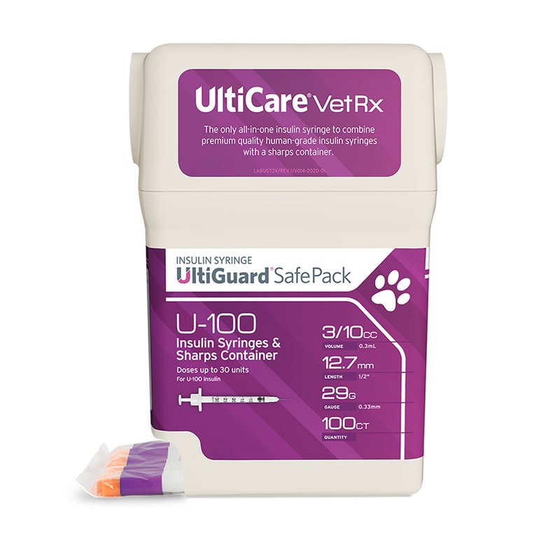 Pets are more than just animals; they’re members of our families. At VetRx Supply, we believe your family deserves the best care available with products designed to ease the burden of treating diseases like diabetes for your pets. With 100 ultra thin insulin syringes and a built-in sharps disposal container, the UltiCare VetRx UltiGuard Safe Pack is the best at-home dog/cat care kit available for you to give your diabetic pet insulin shots. UltiCare VetRx U-100 insulin syringes are specifically designed for use with U-100 insulin and is the only product that combines sterile syringes with a sharps container for safe and convenient disposal. Our human-grade premium quality syringes ensure your pet experiences a more comfortable injection without having to make frequent trips to the veterinarian’s office. With high clinical standards in mind, this multi-pack of syringes is a simple way to give your furry friend the medicine that they need. With UltiGuard Safe Pack, you will have the professional storage box, needles, and disposal to properly care for your pet in the comfort of your home. Giving your pet an insulin injection has never been easier. FOR ANIMAL USE ONLY.