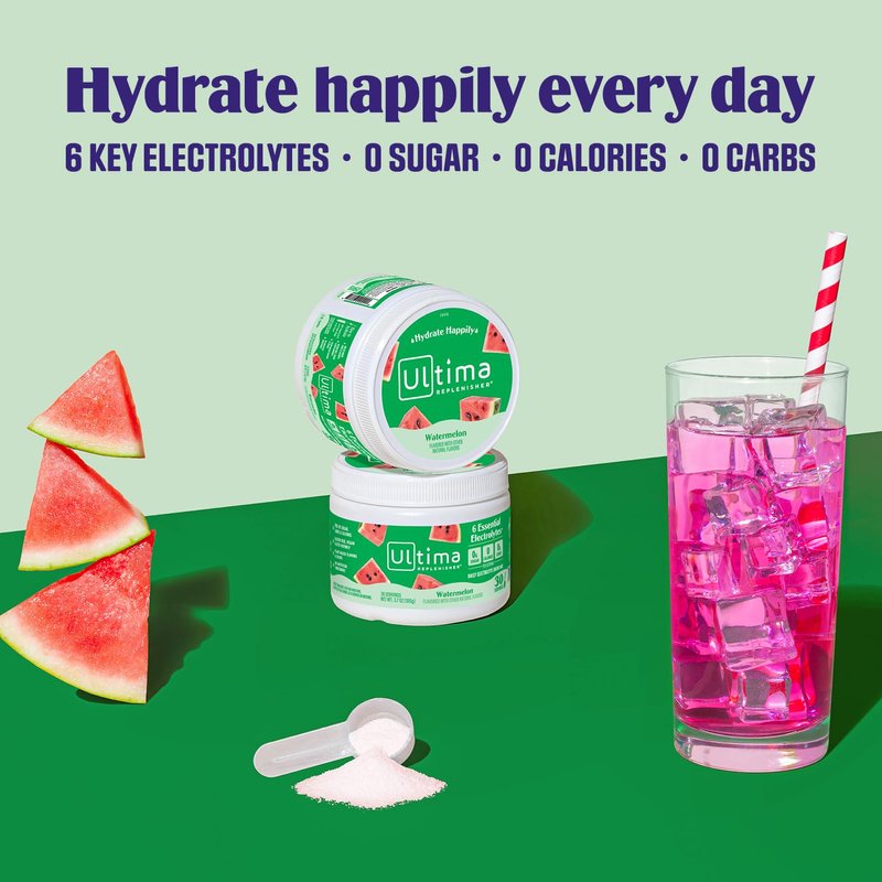 Your daily hydrating drink mix and water enhancer without the sugar, carbs, and calories. Naturally sweetened watermelon electrolytes with organic stevia leaf, infused with real fruit flavor extracts that will truly quench your thirst. Incredibly delicious and nutritious electrolyte drink powder, providing the 6 key electrolytes and minerals your body needs whether you’re working out or hanging out. Drinking electrolyte water provides enhanced hydration compared to plain water and helps your body function at its best. Watermelon is one of the most hydrating fruits out there, and so it’s no wonder our Watermelon electrolyte powder is oh-so-refreshing. Sip up on those super sweaty days to replenish and recharge with this fun, fruity, and juicy Watermelon hydration powder. Available in single-serving Stickpacks or 30- and 90-serving canisters. Dissolve 1 scoop of Watermelon Ultima Electrolyte drink mix or 1 Stickpack in 16 fl oz. of water.