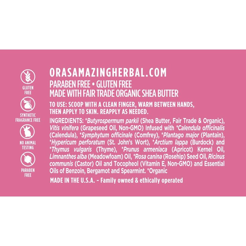 MORE THAN SHEA: Organic and Fair Trade Shea Butter is only the beginning for this intensive VEGAN ultra healing MULTIPURPOSE MOISTURIZER for dry skin. Deeply infused with nutrient dense botanicals, it is formulated to be rich and buttery and will keep your skin happy all day long. Ora uses it in her hair as well. Peppermint Field is our most popular of the Body Butters. To use, scoop out a small amount and warm between hands, it it will become the texture of a rich oil. Massage into dry skin and notice the immediate change in your skin. Take a deep breath through the nose and feel your own gentle expansion, relaxation and clarity. Keep out of heat and sun, shea butter melts easily. IF IT DOES MELT, DON’T PANIC! Freeze overnight, remove from freezer to come to room temp, and stir if necessary.