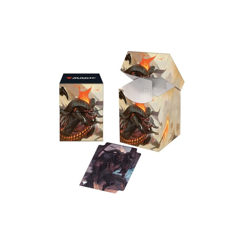 The 100+ Deck Box card storage container features vibrant, full-color artwork from Magic: The Gathering and includes a deck divider. Made with archival-safe, non-PVC, rigid polypropylene materials, you can store up to 100 double-sleeved cards with confidence. The self-locking lid keeps your cards securely stored when not in use, while also offering easy access. Sized for standard size trading cards.