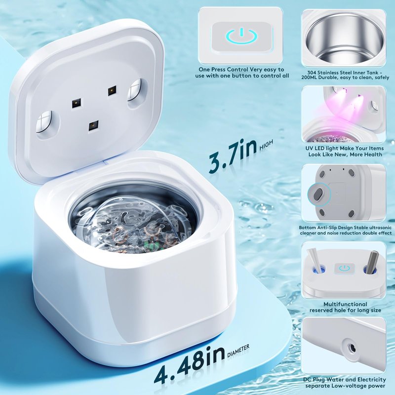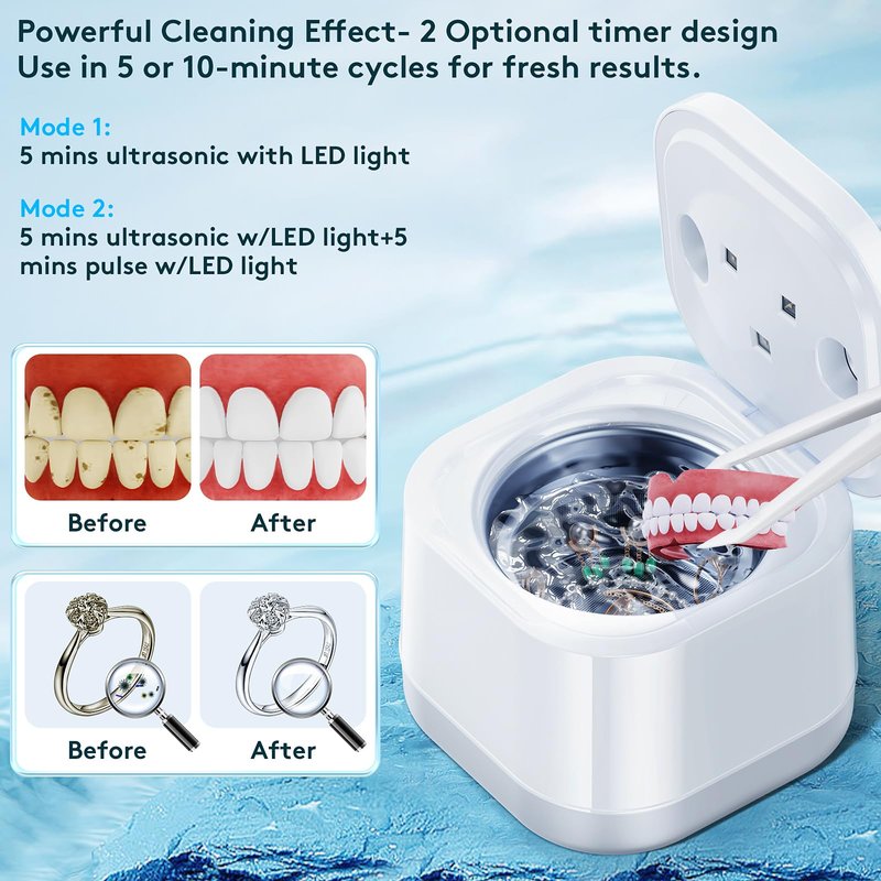 - 【EASY TO USE & LARGE CAPACITY】 The ultrasonic cleaning machine has a one-button touch control, extremely simple operation, and automatically cleans in 5-10 minutes, no need to pay attention at all times. The portable 200ml large capacity is enough to clean dentures, braces, jewelry, and other items, and you can put the ultrasonic cleaner in your suitcase, so convenient. This ultrasonic denture cleaner also makes a great gift for seniors and adults.