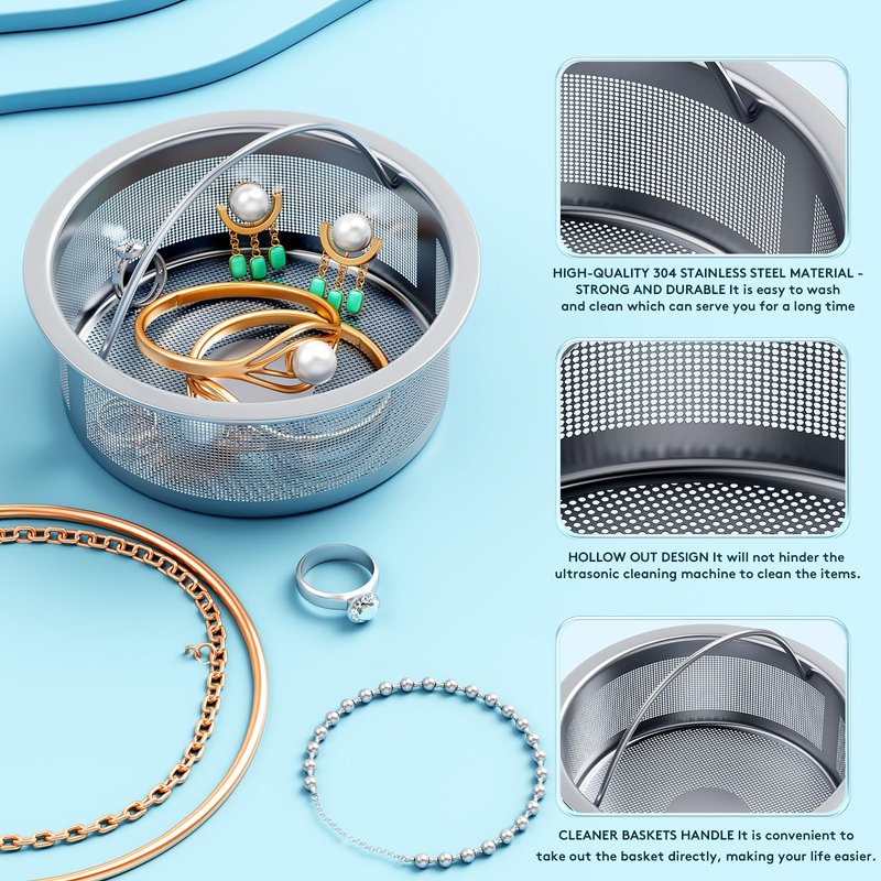 - 【UNIQUELY DESIGNED LOW-NOISE JEWELRY CLEANING MACHINE】 There are 2 multi-functional reserved holes on the top of the ultrasonic retainer cleaner, which is very convenient for cleaning long items such as toothbrush heads and makeup brushes. the shell is made of high-quality ABS material, built-in SUS304 stainless steel liner makes it durable, The bottom is equipped with four anti-slip rubbers, easy to stabilize the ultrasonic cleaner, effectively reduce noise, and use more ease.