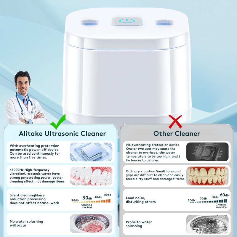 - 【GET A 360° ALL-ROUND DEEP CLEANING】Retainer cleaner machine uses High-Frequency 45,000Hz sound waves to penetrate 360° into crevices and cavities, effectively removing particulates/dirt from dentures, retainers, aligners, braces, whitening trays, night dental mouth guards, toothbrush heads, and even jewelry. make your items look like new and in perfect condition.