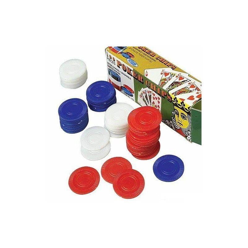 - Listing is for 5 TOTAL CASES of 100 plastic poker chips ( 500 TOTAL CHIPS ) Each case contains a mix of 50 white, 25 blue, and 25 red per case of 100 ( color tone shades may vary from picture due to inventory changes )
