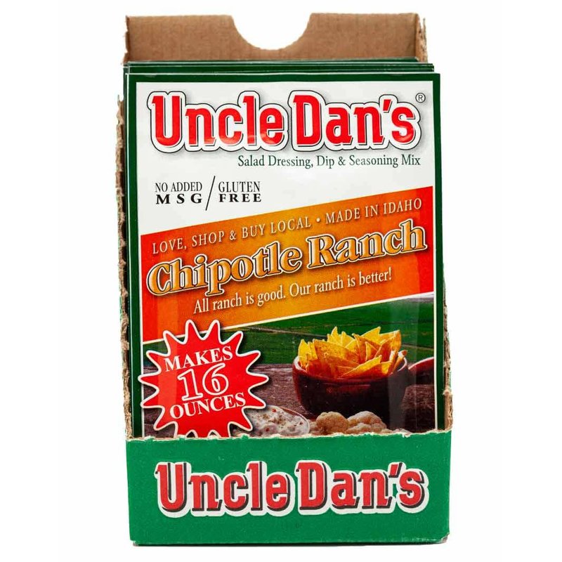 Uncle Dan’s Chipotle Ranch Salad Dressing and Seasoning takes the Original Southern Classic Ranch and gives it a spicy, tex-mex flavor. Classic southwest roasted Chipotle Peppers and Uncle Dan’s Classic Ranch are combined to form a fiesta of flavors perfect for party dips or seasoning for your favorite Mexican-American dishes! Spicy and refreshing all in the same bite! Hold onto your bootstraps, this Chipotle Ranch dip is awesome! Uncle Dan’s gives you the ability to add your own ingredients (ie: buttermilk, mayo & sour cream) to ensure freshness and allows you the flexibility to control fat and calorie content.. We select only the finest herbs and spices to combine them into our secret chipotle ranch salad dressing mix formula. Uncle Dan’s low fat (or fat free) Chipotle Ranch Salad Dressing or Chipotle Ranch Dip makes it easy to enjoy fresh fruits and vegetables and avoid eating unhealthy junk food. Try Uncle Dan’s Chipotle Ranch Salad Dressing Mix in recipes for Chipotle Baked Chicken, Chipotle Ranch Steak Salad, Taco Salad, Steak Fajitas, Turkey Chipotle Chili, Chipotle Chicken Fajitas, Chipotle Mayonnaise recipe, and Much More. Once you try Uncle Dan’s we’re sure you’ll agree that it’s the best Ranch Salad Dressing and Ranch Party Dip you ever tasted. If not, then we guarantee the flavor and will buy it back from you no questions asked. Thanks for trying Uncle Dan’s Salad Dressing and Dip Mix Recipes.