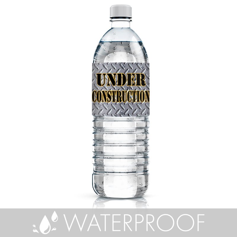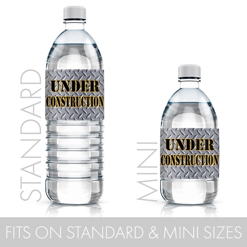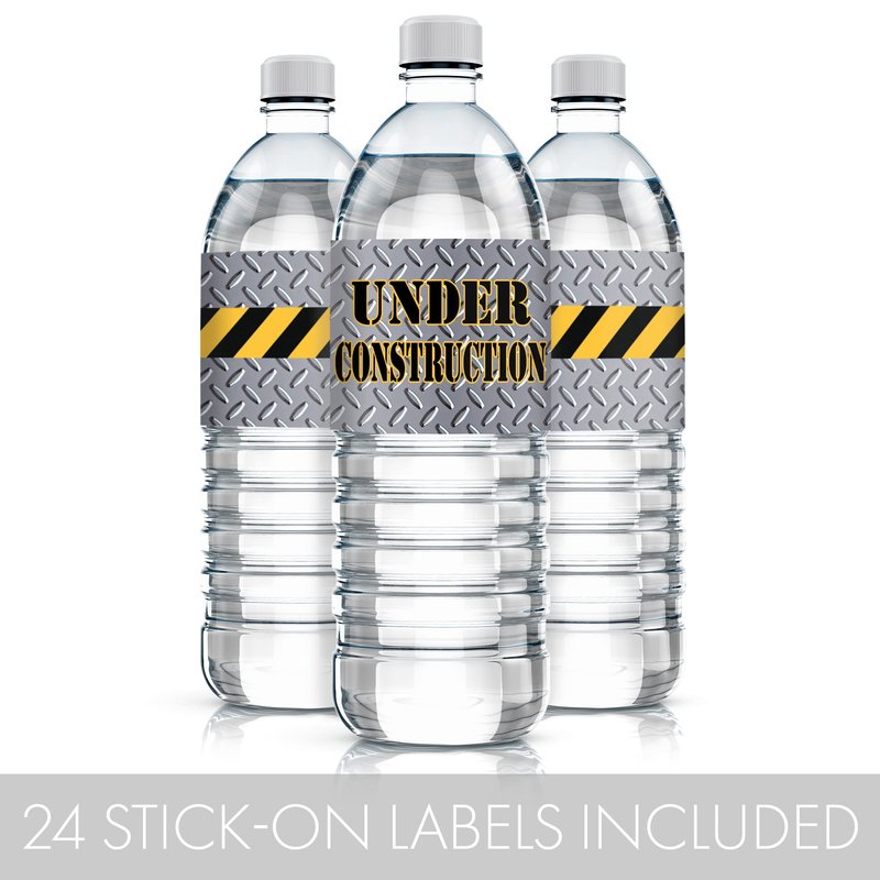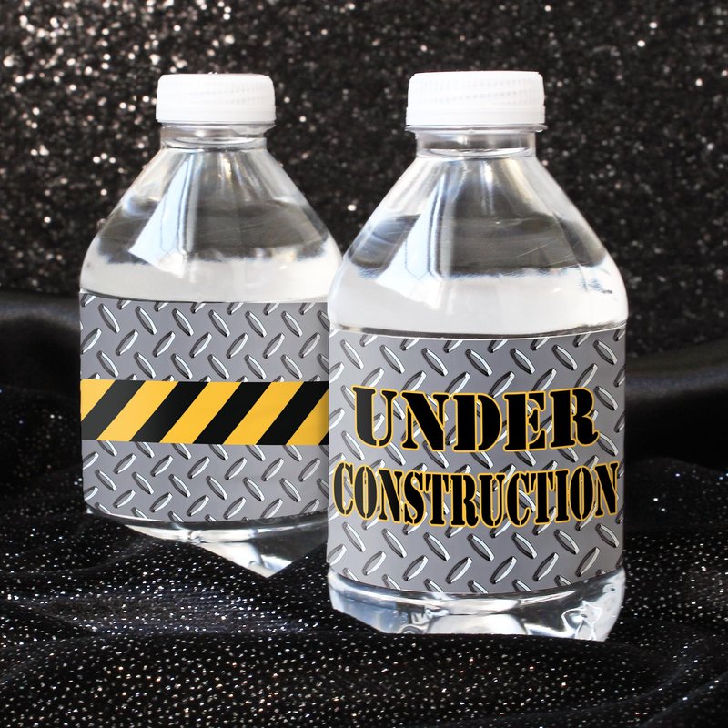 - 24 COUNT: Under Construction Party water bottle labels feature a steel background and caution tape design made to match Under Construction Birthday Party decorations for a dirty 3rdy birthday.