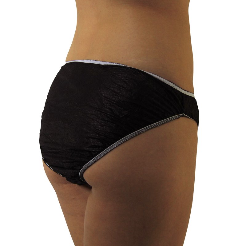 Made of extra soft polypropylene these disposable panties for women are styled as a brief and feature a 100% cotton crotch liner with a fashionable pico trimmed elastic waistband and legs for a snug fit. Every garment is individually roll folded and wrapped for easy transport in your purse or overnight bag. You get 30 individually wrapped briefs packed in 6 packages of 5. Wear & discard! Perfect for menstrual days, hospital stays, spa visits, while traveling, camping, before or after workout. 30-Pack. White and Black are available.