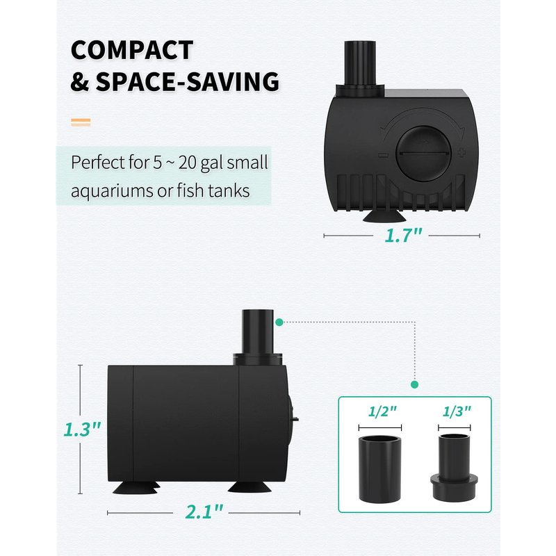 - Versatile Pump: Measure 2.1" L x 1.7" W x 1.3" H (Confirm the Size Carefully!). Suit indoor and outdoor use like bird bathing, sculpture cleaning, fountains, aquariums, etc.