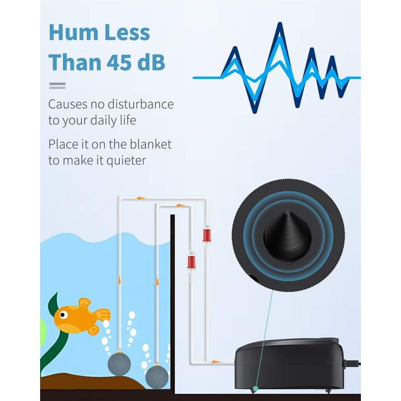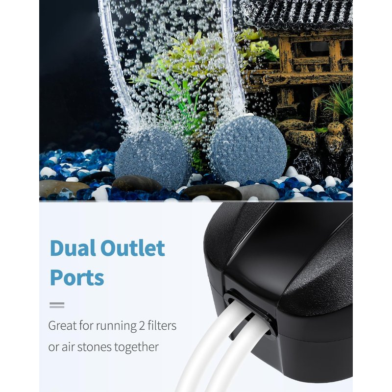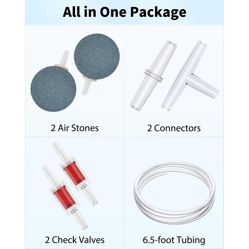 - Pump Accessories: Include 2 air stones, 6.5-foot airline tubing, 2 check valves and 2 connectors. Complete accessories to build the basic aeration setup in your fish tank.