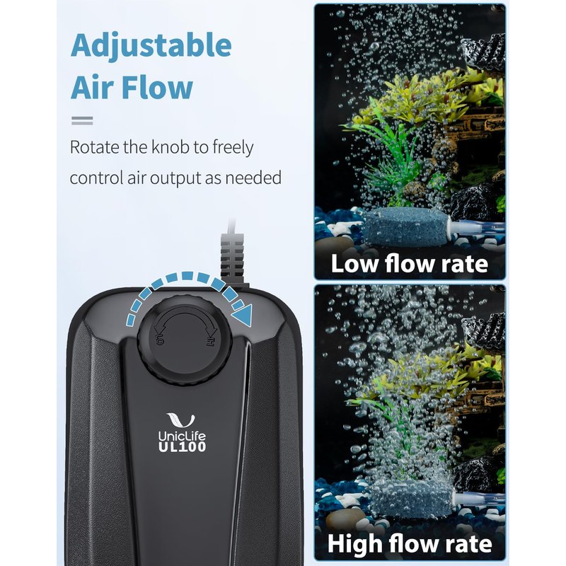 - Adjustable Air Flow: Rotate the knob to freely control the flow rate for dual outlets. Greatly meet your desired air flow to keep fish or roots healthy. Ideal for fish tanks, small ponds or DWC systems.