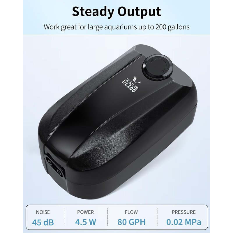 - Steady Output: Max Air Flow Rate: 80 GPH; Pressure: 0.02 MPa; Power: 4.5 W. Perfect for aeration in fresh water and marine aquariums up to 200 gallons.