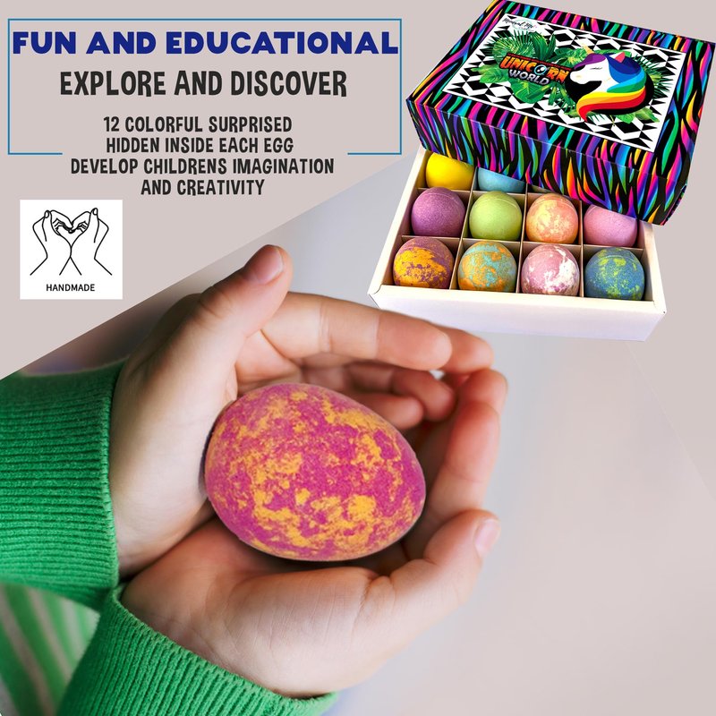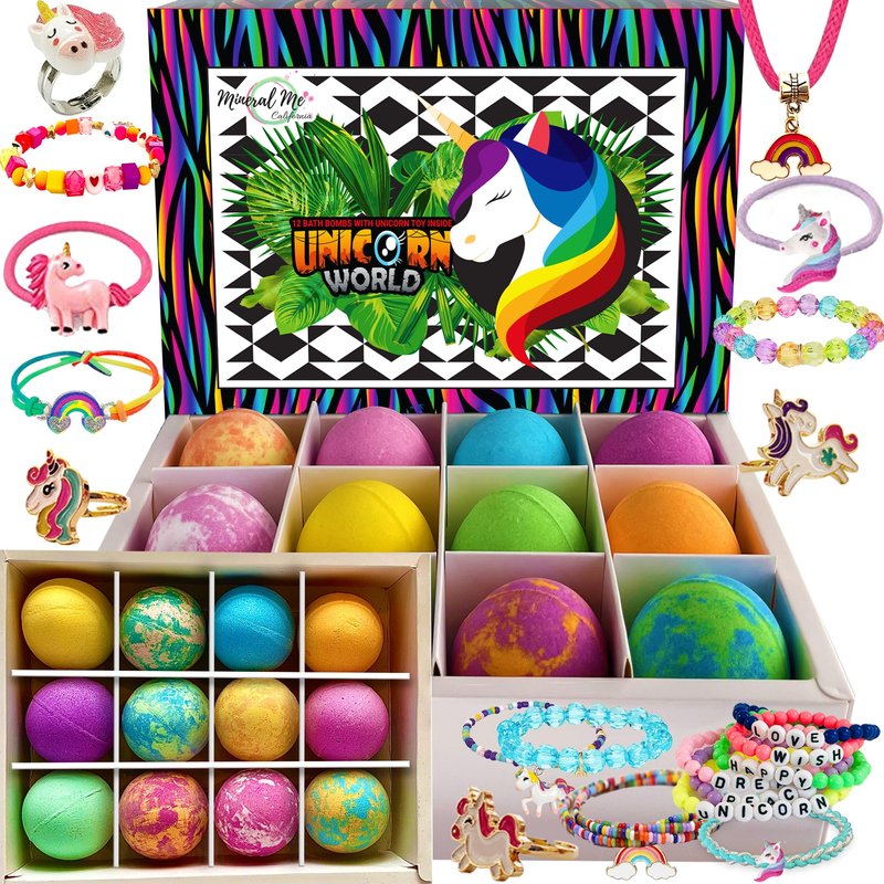 - 12 Magic Unicorn Bath Bombs with high quality designer jewlery surprises - All natural ingredients with no undesirable additives. Your kiddo will love the colorful scented water, bubbly foam, and a unique surprize jewlery in each egg bathbomb.