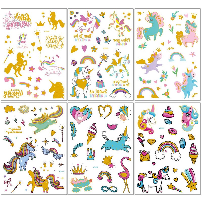 - Unicorn themed creative tattoo. Package contain 58+ large unicorn flash tattoos temporary tattoos for kids. Add a touch of colorful to your arms, shoulders, legs, and other body parts with realistic full-color (pink+green+blue+ gold metallic glitter color ) ,a series of funny style to provide big fun for both children and adults alike!