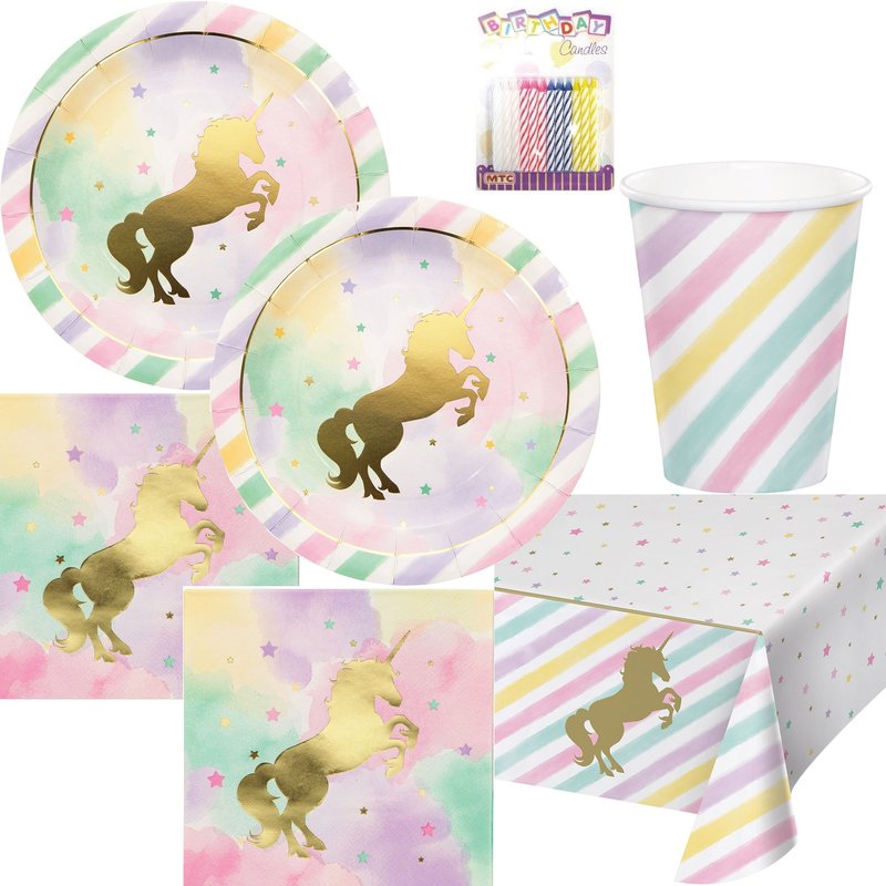 Unicorn Sparkle Party Supplies Pack Serves 16: Dinner Plates, Luncheon Napkins, Cups, and Table Cover, with Birthday Candles Deluxe (Bundle for 16)