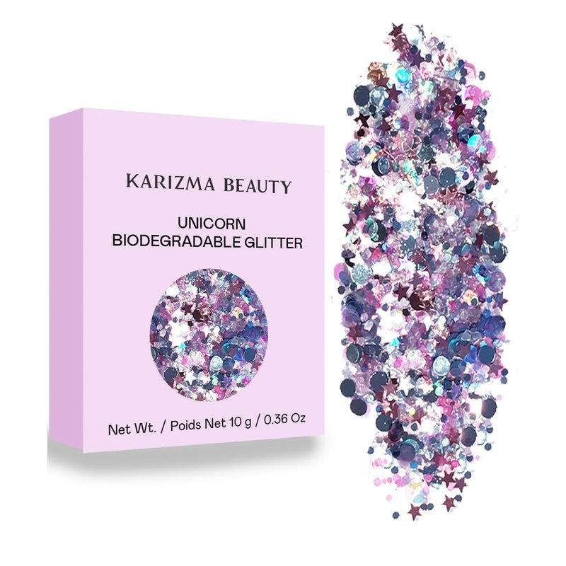 - KARIZMA GLITTER: Sparkle season is here. Take it to the next level with our Unicorn Strobe Bio Face glitter featuring little stars, dust and hexagons for an irresistible glow. Our cosmetic glitters are made with designer formulas, high intensity pigment and metallic shine. The chunky glitter collection features 8g of Karizma glitter, perfect for gifts and your glitter addiction.