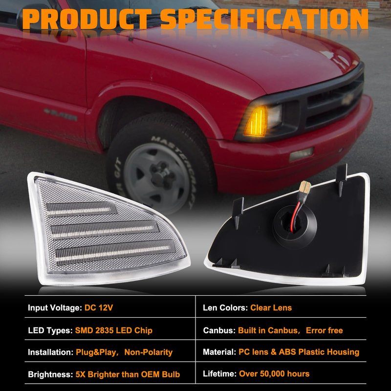 - 【HIGH QUALITY & EASY INSTALLATION】Chevy Blazer LED Side Marker Lamps Assembly made of high-quality ABS housing & PC lens to ensure the long lifespan, IP67 waterproof and ultra-durable, low power consumption and energy saving. Canbus Design, Error free.Non-Polarity, Plug and Play to install within 5-10 minutes and direct replacement for side marker, no drilling or modification required. Remove original one to plug these upgrade version lights.