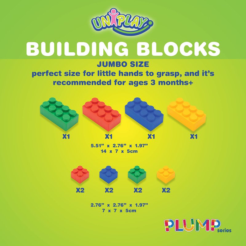 - Early Cognitive Development: Fuel your child's cognitive growth and motor skills development with UNiPLAY Plump Soft Building Blocks. These jumbo, multicolor blocks engage young minds in a colorful world of learning, starting at just 3 months old