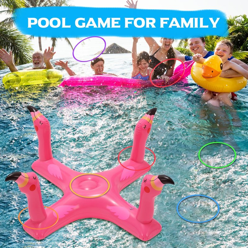 - FUN POOL GAMES: The inflatable flamingo crossed ring toss game is a big hit for kids and friends. Package includes 1Pcs inflatable flamingo crossed ring toss and 6Pcs rings