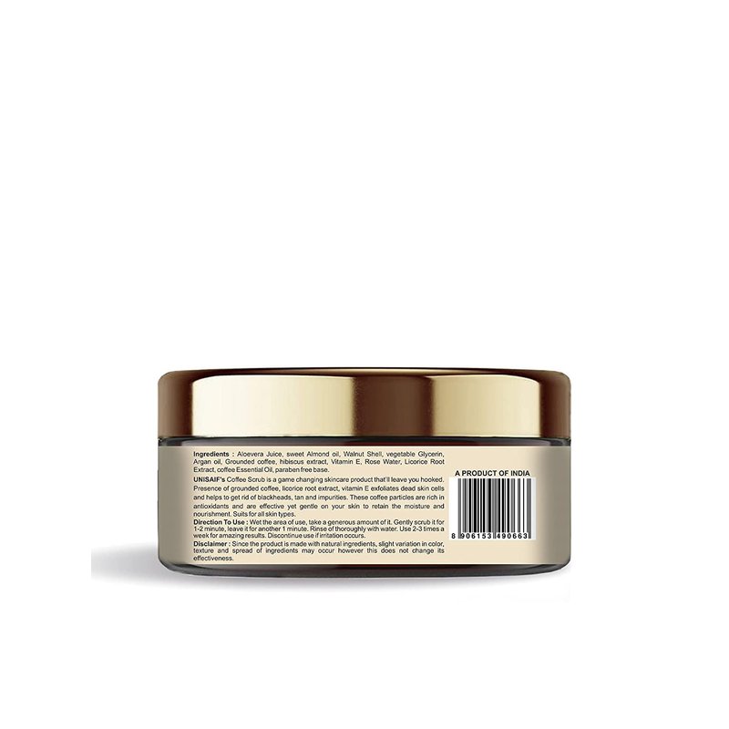 - ā ORGANIC BODY SCRUB: UNISAIF's Coffee scrub enriched with aloevera juice,sweet almond oil,walnut shell ,vegetable glycerin,argan oil,grounded coffee,hibiscus extract,vitamin E,rose water,licorice root extract,coffe essential oil ,paraben free base