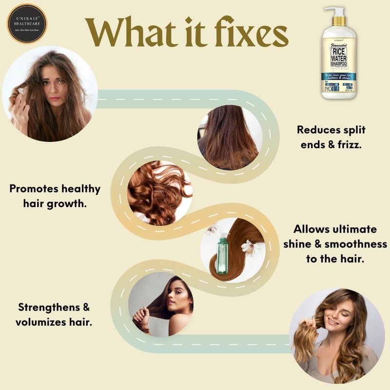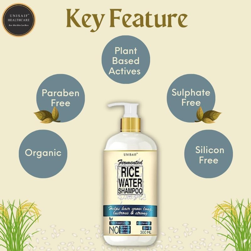 - ✅Natural & Organic: Unisaif Rice water hair growth shampoo is natural and a blend of nourishing ingredients like soy protein, coconut oil, almond oil and formulated with rice water that work together to deliver long-lasting hydration and nourishment to your hair.