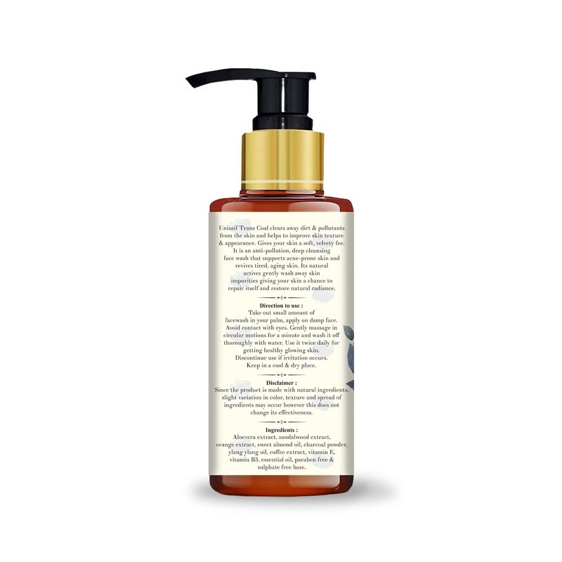 - Natural Face Wash: Unisaif transcoal charcoal face wash is enriched with sandalwood extract, orange extract, sweet almond oil, charcoal powder, coffee extract and essential oil which is free from parabens and sulfates. Experience the power of activated charcoal in this deep cleansing facewash for a clearer and healthier complexion.