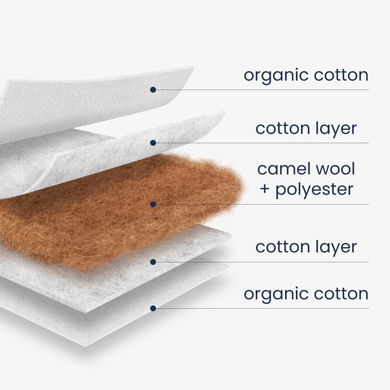 - The baby infant sleeping bag is made of organic cotton,wool,and polyester. This product composition ensures the sleeping bag is durable, soft, wash-resistant, and maintains its loftiness over time. It can be cold machine washed (<40 centigrade) in a gentle cycle. Low tumble dry. Iron at low temperature if necessary.