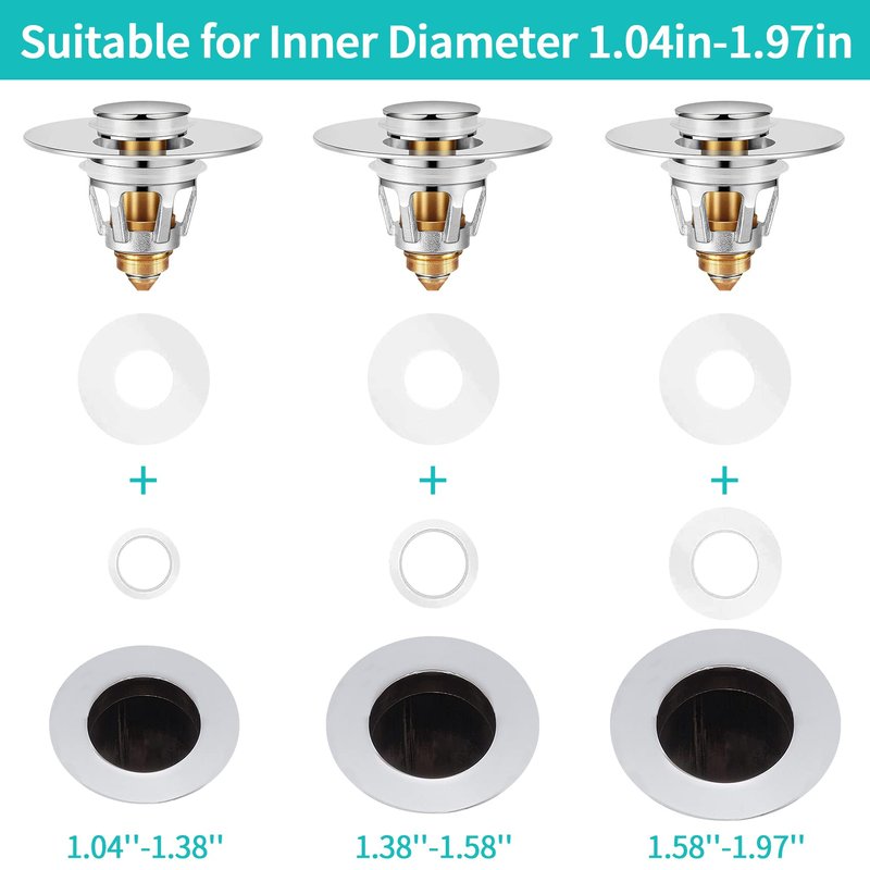 - 💦[ Universal Size ] The bathroom sink stopper plug is mainly made of high quality thickened brass material, can be used for the different types of basin drain. The inner diameter of sink stopper strainer is 1.04’’. Suitable for drain holes with an inner diameter of 1.04-1.97 inch.