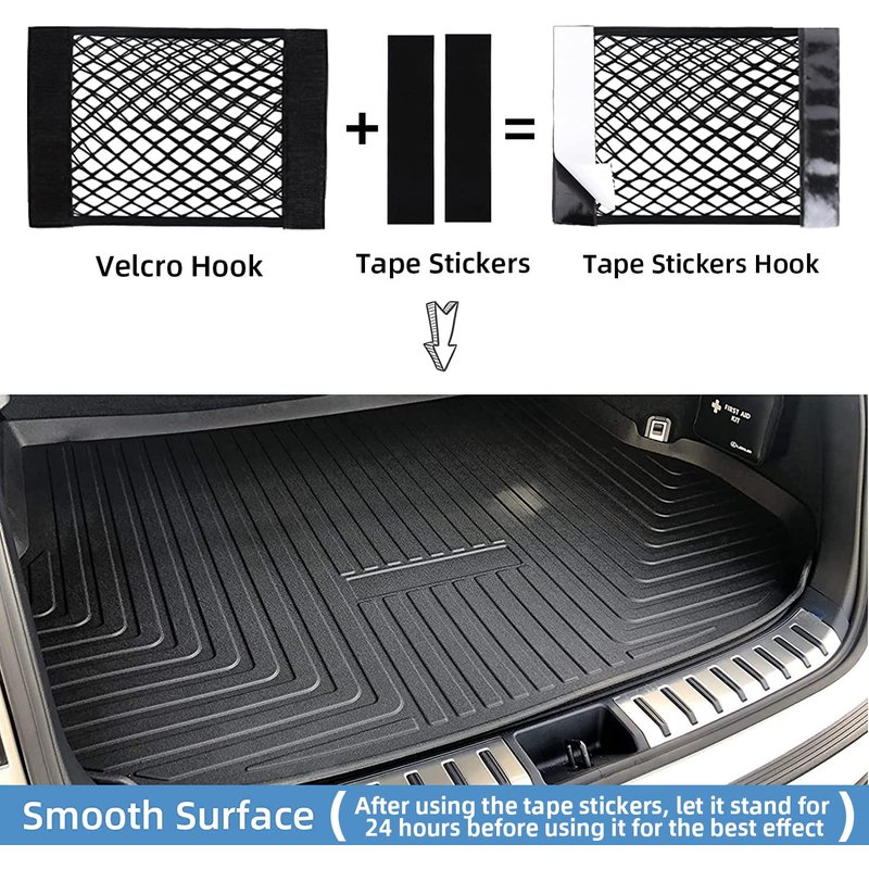 - 【UNIVERSAL FIT】The size of the car storage net is 15"x 9.5",2-1/4"wide one-side hook magic tape on the back side. Easily and securely attached onto car trunk or back seat with fluff surface (e.g. carpet).