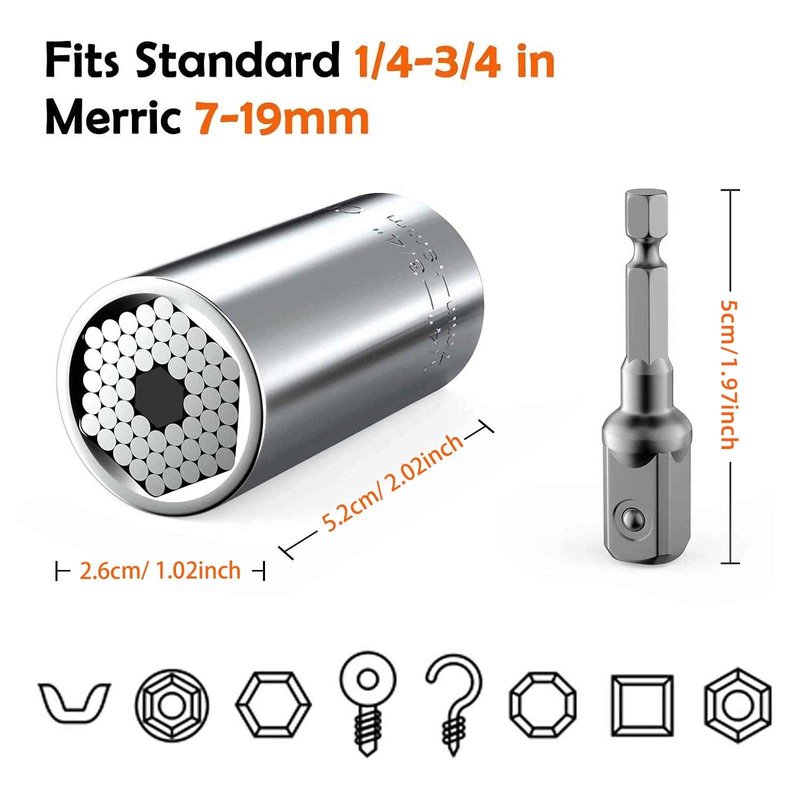 Why Choose Us? This Universal Socket fits both standard 1/4 to 3/4 inch and metric 7 to 9 mm that can grasp any shape nut, such as wing nut, hook nut, hex nuts, square nuts, crew eyes, bolt heads, and even worn and Damaged nut. This Universal Socket is small and light and can replace a whole socket set. You can keep it in your car, boat, bike, backpack, tackle box, or back pocket. Amazing Gift for Men & Women Ideal and unique gift for men, women, dad, husband, boyfriend, friends, or grandma on Christmas, Birthday, Thanksgiving, or Father's Day. Perfect gadget for home improvement, construction, carpentry, auto repair, and other household maintenance. The must-have gift for the Handyman, Do-It-Yourselfer, or Mechanic. This Universal Socket is a great stocking stuffer!