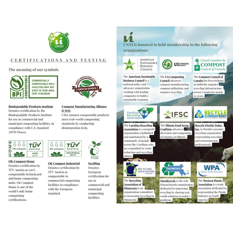 - CERTIFIED COMPOSTABLE IN U.S. & EUROPE: Certified by the Biodegradable Products Institute (BPI) under US standard ASTM D6400. Certified OK Compost Home under European standard EN 13432 by Vinçotte and Tüv Austria. OK Compost Home certification guarantees 100% BIODEGRADABILITY IN HOME COMPOSTING facilities. Compost Manufacturing Alliance (CMA) Approved: CMA verifies the compliance of UNNI compostable products with real-world composting standards through disintegration tests.
