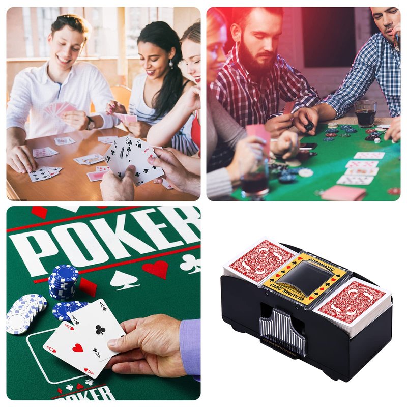 - 【Great Choice for Card Game】Made with the strongest ABS material, Unniweei automatic card shuffler with high shuffling speed is perfect for Casino Card Game for Poker, Home Card Game, UNO, Phase10, Texas Hold'em, Blackjack, Home Party Club Game. The card shuffler can quickly and smoothly scramble the playing cards and collect them into the tray. After inserting the cards into the openings on both sides of the product, they will be automatically shuffled with a single push of the button.