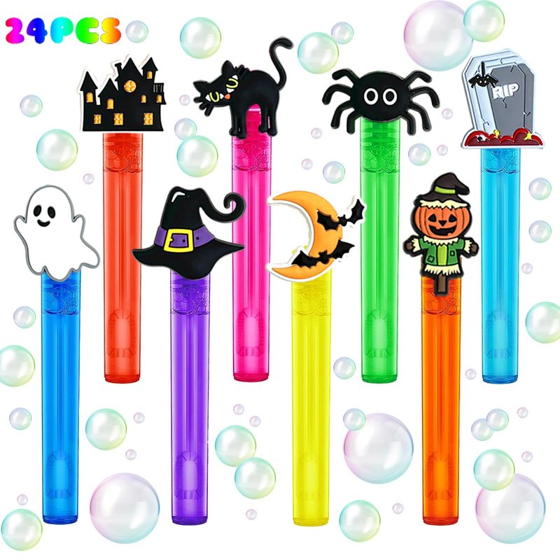 - Halloween Theme Bubble Wand Set Include-Bubble soap liquid set of 24pcs mini bubble wands,8 colors(3style pieces per color).As party supplies reunion fun for kids,make your Halloween party amazing