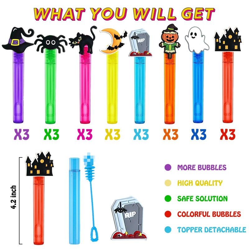 - Colorful And Multi Pattern Design-Halloween themed mini bubble wand has 8 colored bubble tubes and 8 different Halloween theme patterns, pumpkin chost spider bat cat which is very cute. And our bubble toppers are detachable, you can collect them or use them for other things, which is also a pleasure