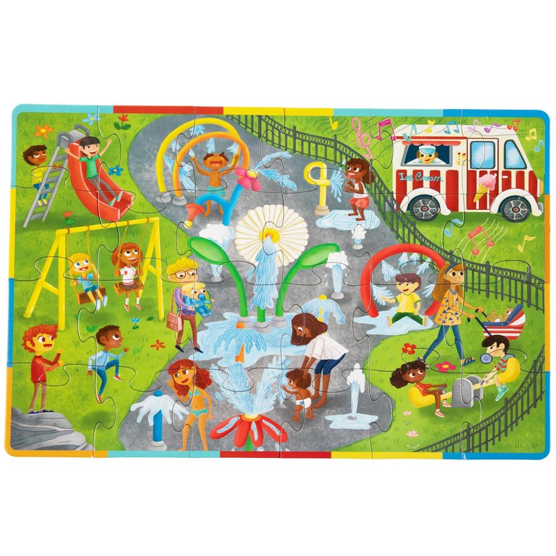 - 2-SIDED KIDS PUZZLE: Vibrant and joyful, the Splash Parks & Ice Cream Cones 2-sided jumbo puzzle reflects everyday scenes of childhood spent swinging, sliding, and splashing at the playground, a familiar multicultural scene for children across the nation.The other side has a 1 through 10 counting activity with ice cream treats.