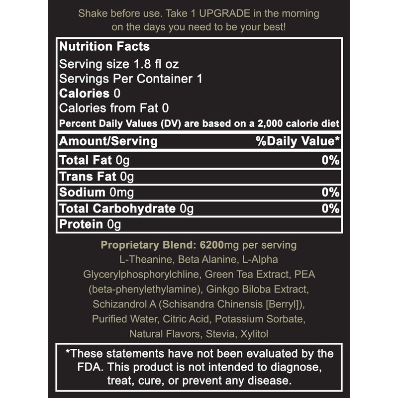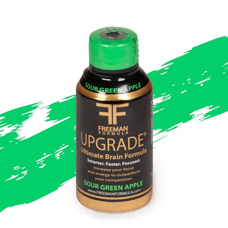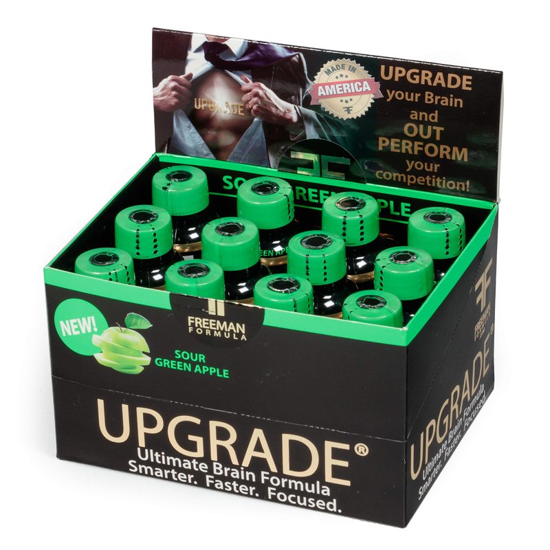 In the 12 pack of Freeman Formula Upgrade Brain Supplement 1.8Fl oz Bottles you get the energy boosting green apple flavored super drink. Upgrade is a brain formula that creates long-lasting, non-jitter, no-adrenal stimulant energy, incredible mental clarity, and sustained focus. Every bottle of Upgrade was formulated to work with your body rather than against it. Other energy products down-regulate the adrenal function, creating adrenal fatigue which results in low energy, weight gain, exhaustion, dulled senses, and sluggishness. Upgrade helps you be the best you. In the bottle you will find mental clarity, boosted memory & concentration, and the energy to get it done. Regardless of if you are a businessman, teacher, gamer, athlete, engineer, or etc. Freeman Formula Upgrade will upgrade your system!