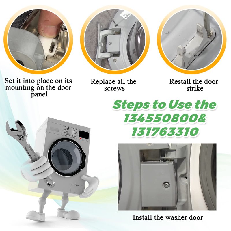 - ✔✔【DIY INSTALLATION】: The installation of 134550800 ps1152380 Washer Door Hinge & frigidaire 131763310 Washer Door Strike are simple. You need a screwdriver and work gloves ready. Wear gloves to protect your hands and cut off power and water before you start. Take the door off, remove the door gasket and latch inside, take out the old Washer 134550800 ap3886714 Door Hinge & 131763310 Door Strike Kit and put in the new one. They help secure the washer door from opening while it is running