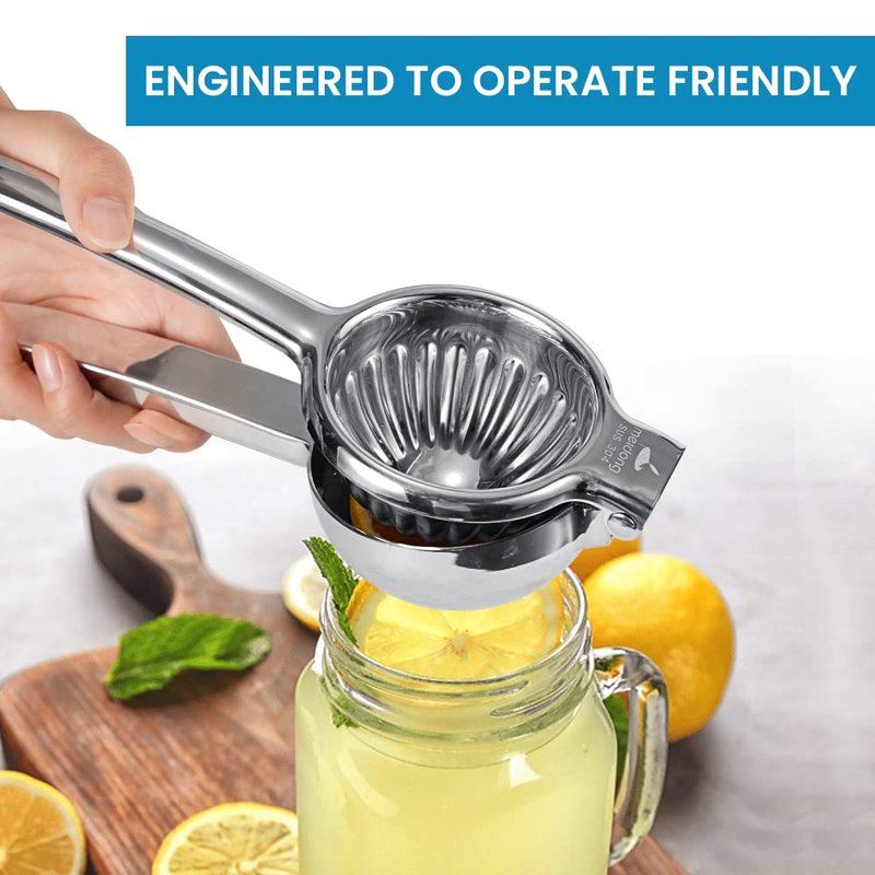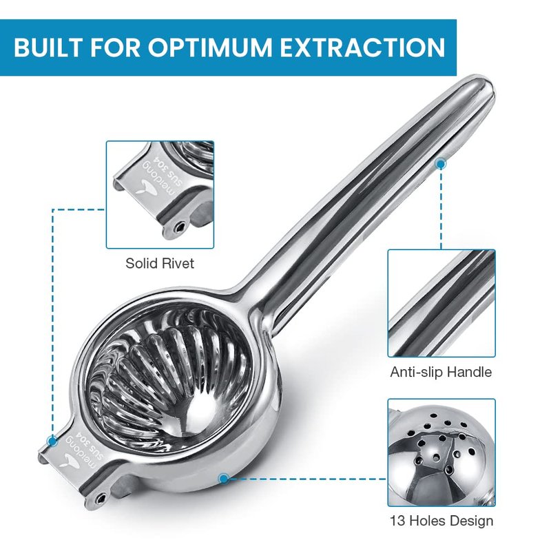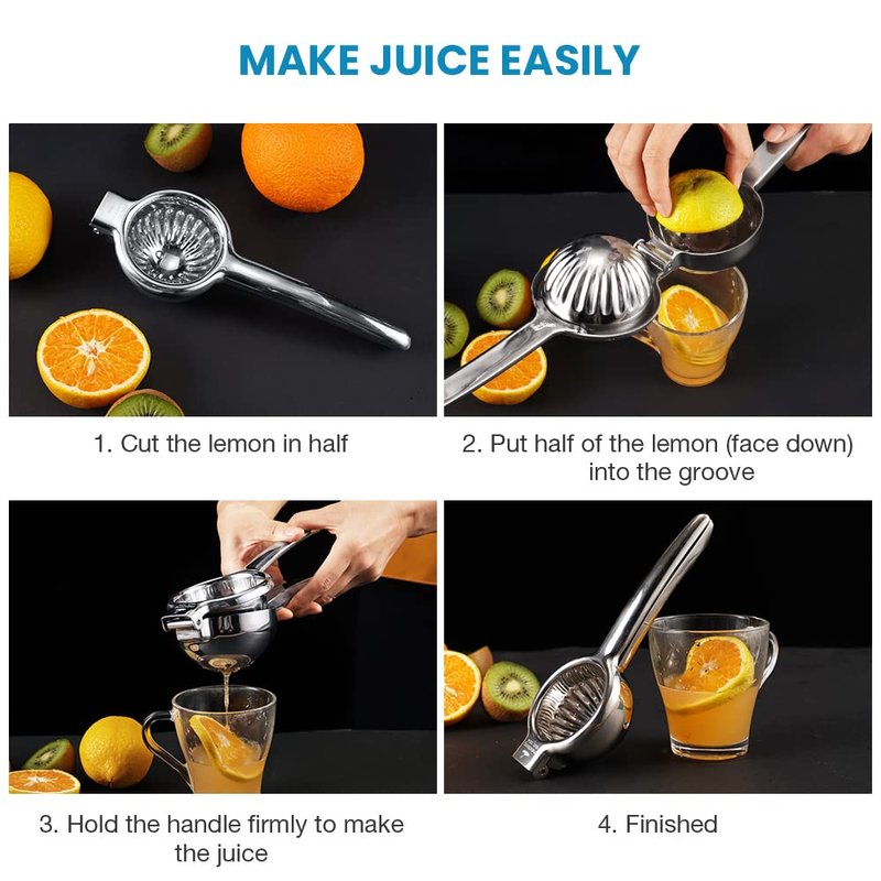 - Super High Quality: This stainless steel lemon squeezer is made entirely of food-grade 304 stainless steel. The rivet attached handle is scientifically connected and the whole lemon juicer is durable enough to last 100 years. The surface is chrome-plated, corrosion-resistant and will not be affected by any acidic liquids.