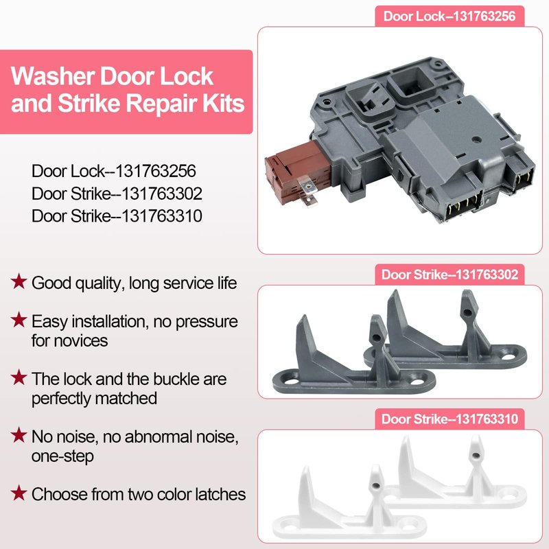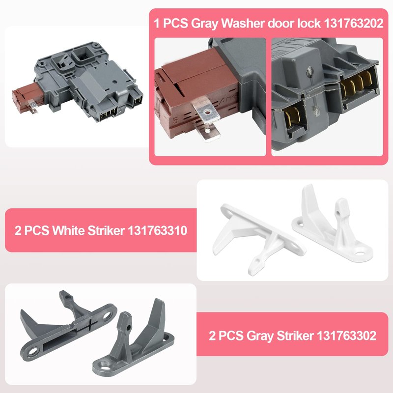 - 【What you get】1Pack 131763202 Washer Door Lock Switch Assembly & 2Pack 131763302 Washer Door Striker & 2Pack 131763310 Washer Door Strike. We provide 18-Month Warranty and guarantee you the best service.