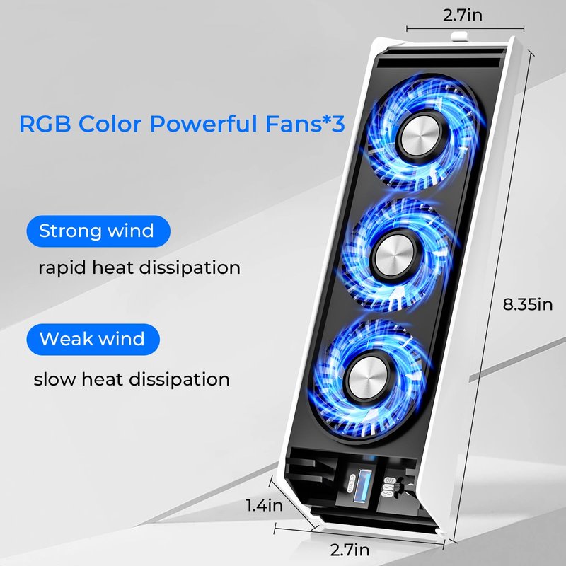 - 🆒【Adjustable Fan Speed】:The ps5 cooling system has 3 small fans light up and rotate when plugged in. A small toggle at the bottom sets fan speed to off, low or high.