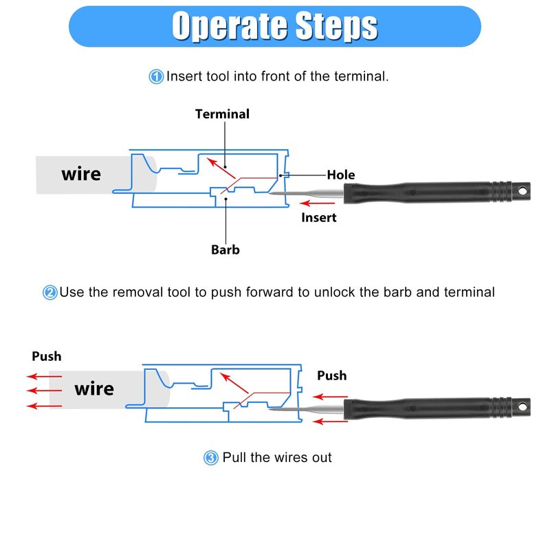 - SAFETY PROTECTIVE CASE: The terminal ejector kit is sharp, so we provide you with a protective case to prevent children from playing with it, and keep you and your family safe. All pin removal tools are placed in a protective case, small and lightweight, and easy to carry.