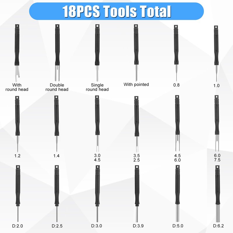 - 18 PCS IN 1: You will get 6pcs single pin extractors, 6pcs double pin extractors, 6pcs casing tools, and a protective case. Total 18pcs terminal picking needle, different sizes to fit most terminals and meet your needs in different scenarios. No duplicate, each one is unique!