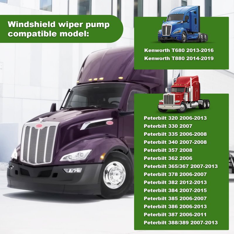 - 【Washer Fluid Pump】Compatible with Kenworth T680(2013-2016), T880(2014-2019) and Peterbilt 320(2006-2013),335 (2006-2008), 340( 2007-2008),357 (2008),362(2006),365/367(2007-2013),378(2006-2007),382( 2012-2013),384( 2007-2015),385( 2006-2007), 386 (2006-2013),387 (2006-2011),388/389 (2007-2013).