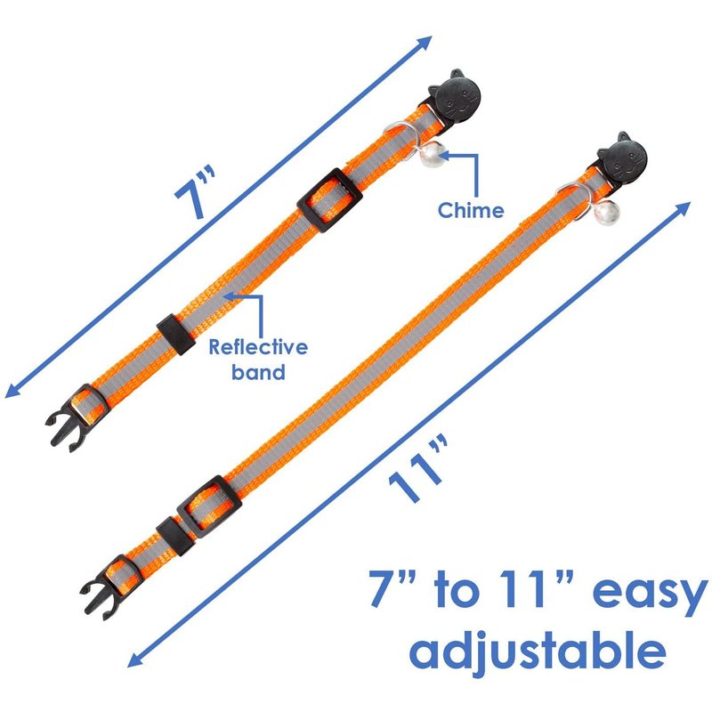 NEW & IMPROVED 6-PACK - Our cat collar set contains 6 high quality cat collars of different colors (red, blue, orange, green, purple, pink) HIGH QUALITY KITTY COLLARS - Our reflective cat / dog collar is solid, made of nylon. Comes with bells. WORKS ON MANY PETS - Great collars for cats and small dogs and other small pets as well. ADJUSTABLE SIZE - The size of the Breakaway Cat Collars is 7-11" (adjustable range)
