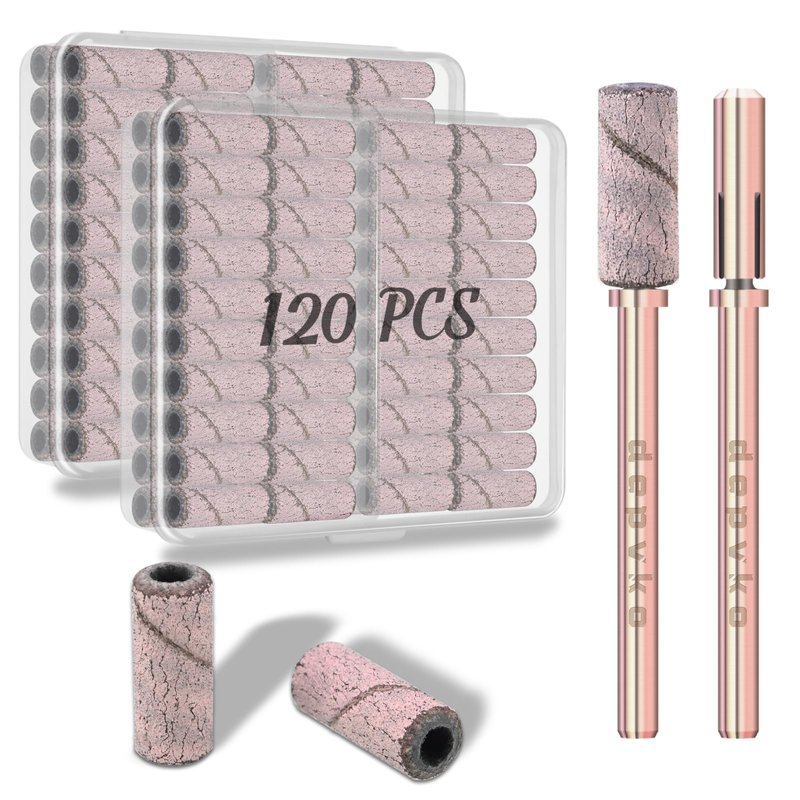 [Upgrade]Depvko 120pcs Small Sanding Bands for Nail Drills with 2pcs 3.1MM Mandrel Nail Drill Bits, 180 Fine Grit Nail File Sanding Bands for Acrylic Nails Tech Gel Manicures and Pedicure, Pink