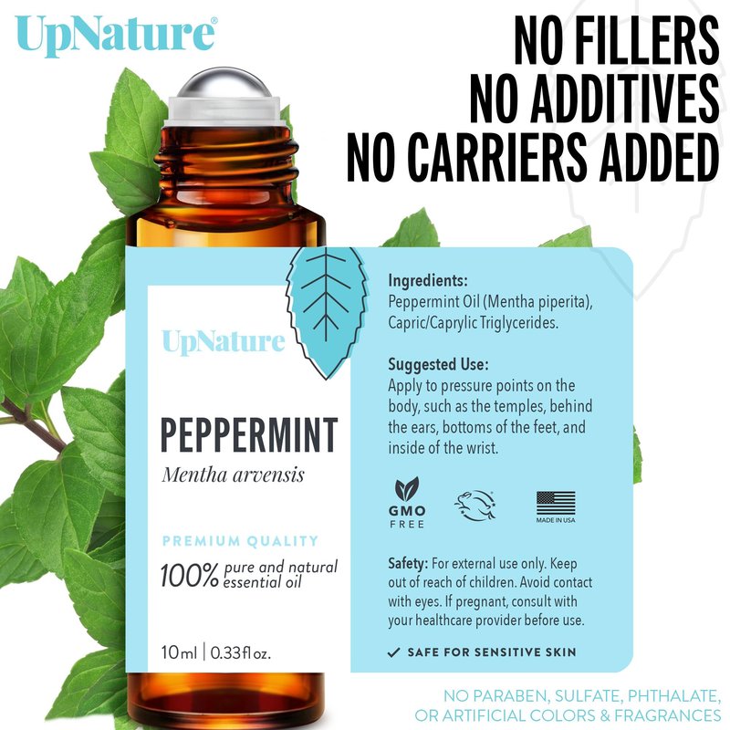 UpNature Peppermint Essential Oil Roll On - Relieves Head Tension, Pregnancy Essentials, Reduces Stress & Soothes Aches- Premium Quality, Therapeutic Grade Aromatherapy Oil
