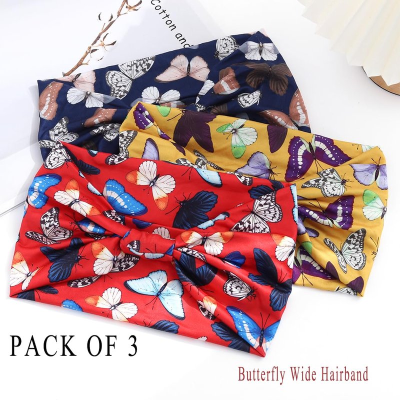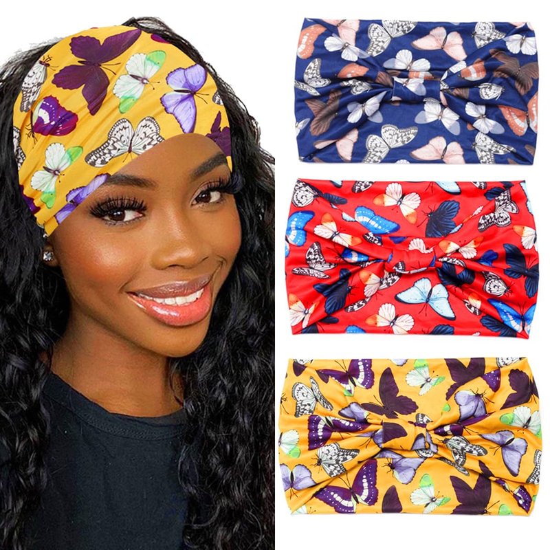 Urieo 3 Pcs Boho Printed Headbands Butterfly Wide Hairband Stretchy Knotted Turban Headband Yoga Workout Non-slip Head Wraps Headband for Women