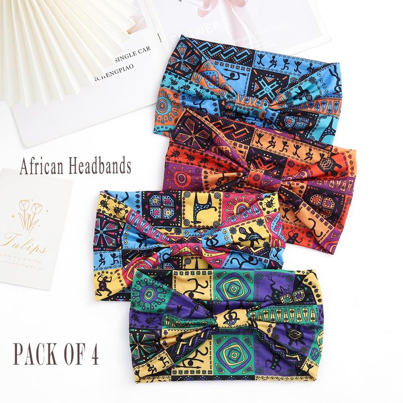 Urieo 4 Pcs African Turban Headband for Women Printed Hairband Knotted Stretchy Head Band Workout Yoga Non Slip Wide Headbands